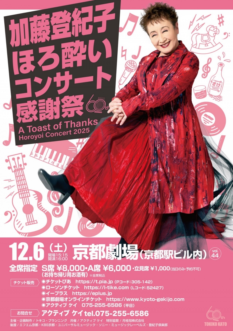 京都劇場 (京都) 2025年 12月6日(土) 15:15開場 16:00開演 加藤登紀子ほろ酔いコンサート2025 お問い合わせ先アクティブケイtel.075-255-6586チケット発売 9/8~ 一覧に戻る
