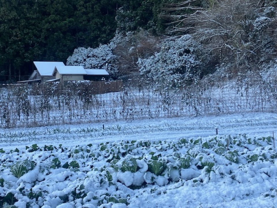 2日の夜にはボタン雪が降って、畑は真っ白に雪化粧。