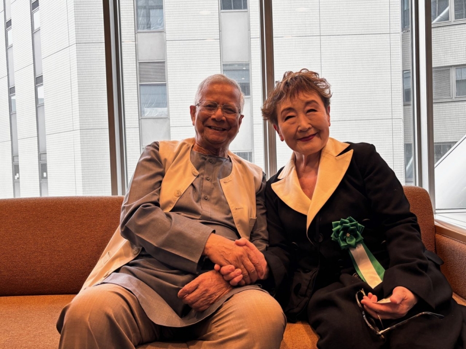貧しい庶民が起業できるように小さなお金の融資をするグラミン銀行の指導者として2006年にノーベル平和賞を受賞されたユヌスさんは、私がお会いしたすぐ後の3月に政府側の圧力でグラミン銀行総裁を解任される、という大変な出来事があり心配していたのでしたが、2024年の反政府デモで崩壊したハシナ政権に変わり、暫定政府主席顧問として新しい民主体制を築くために帰国し、大仕事を果たされたばかり。この時期に来日されるのが本当に嬉しくて飛んでいった、というわけです。