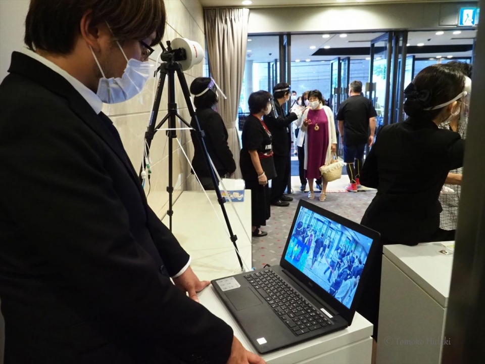 入口ではアルコール消毒の後、間隔を空けて一人ずつ中へ。体温感知カメラのチェックを受けた後、会場へ足を踏み入れることが出来る。